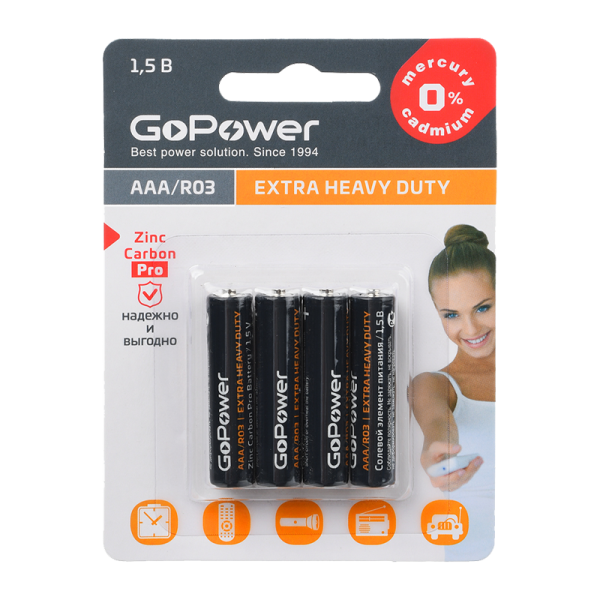 Батарейка GoPower R03 AAA BL4 Heavy Duty 1.5V (4/48/576) (блистер 4шт)