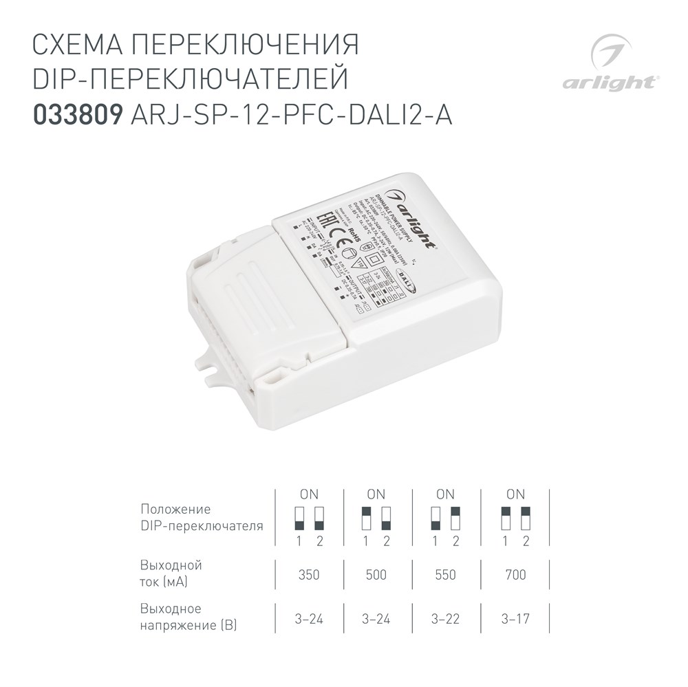 Блок питания ARJ-SP-12-PFC-DALI2-A (12W, 3-24V, 0.35-0.7A) (Arlight, IP20 Пластик, 5 лет)