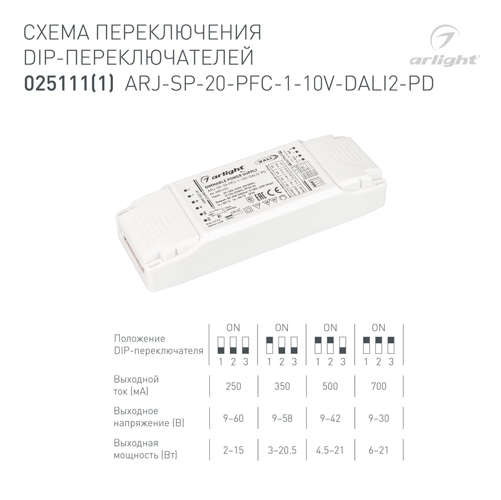 Блок питания ARJ-SP-20-PFC-1-10V-DALI2-PD (20W, 250-700mA) (Arlight, IP20 Пластик, 5 лет)