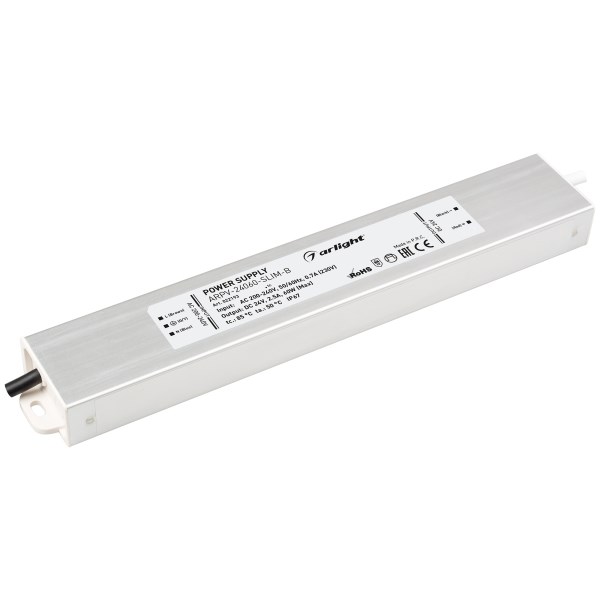 Источник напряжения с гальванической развязкой для светодиодных изделий. Входное напряжение 200-240 VAC. Выходные параметры: 24 В, 2,5 А, 60 Вт. Встроенный PFC >0,5. Герметичный алюминиевый корпус IP 67. Рабочая температура -25…+50C⁰. Габаритные размеры длина 253 мм, ширина 40 мм, высота 23.5 мм. Гарантийный срок 3 года.