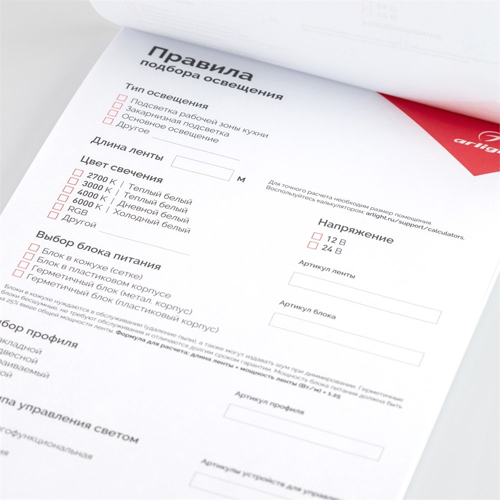 Блокнот- подсказка Правила подбора ленты, блоков питания, профиля и управления (Arlight, -)