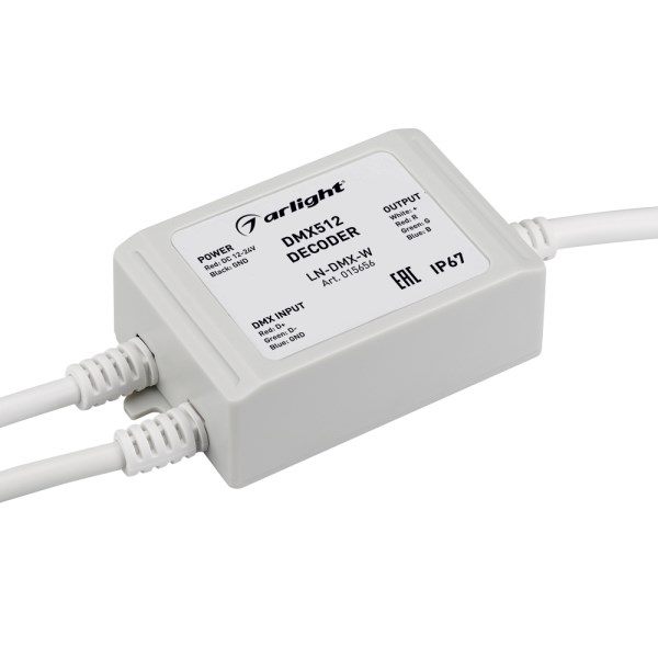 Влагозащищенный RGB DMX-декодер. Имеет DMX512 вход и ШИМ (PWM) выход. Напряжение питания DC 12-24V, 3 канала управления, ток нагрузки 4А на канал. Степень влагозащиты IP67, габариты 97x52x30мм.