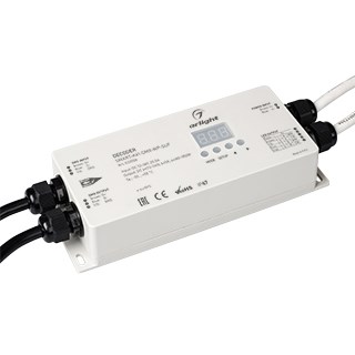 Влагозащищенный (IP67) декодер (преобразователь) цифрового сигнала DMX512 в ШИМ для управления светодиодными лентами. Декодер может регулировать яркость мультицветных лент, осуществлять включение и выключение света, управлять цветом. Декодер совместим с панелями управления с выходом DMX512 и контроллерами DMX512. Также, управление декодером осуществляется кнопками на корпусе, а информация о режиме отображается на цифровом дисплее. Степень защиты устройства позволяет его использовать его во влажных условиях с краткосрочными погружениями под воду. Питание декодера имеет диапазон напряжений от 12В до 36В, максимальный ток 5А на 1 канал, максимальная мощность 240-720Вт (в зависимости от напряжения питания), 4 канала управления. Габариты декодера составляют 176x78x38мм, корпус белого цвета. Для сохранения класса герметичности IP67, все подключения производить в герметичных коробках или с использованием специальных клемм, обеспечивающих класс IP не ниже 67.