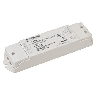 Диммер для управления мультицветными (RGB) светодиодными лентами по ШИМ и другими светодиодными источниками света с напряжением питания 12-48В. Выполняет основные фукнции: включение/выключение, регулировка яркости и цвета. Устройство совместимо с радиочастотными пультами дистанционного управления и настенными панелями управления серии SMART. Возможна привязка до 10 пультов или панелей управления. Питание от 12-48В, 3 канала управления, максимальная нагрузка 6А на канал, выходная мощность 216-864 Вт (в зависимости от напряжения питания). Габариты устройства 175x45x27 мм.