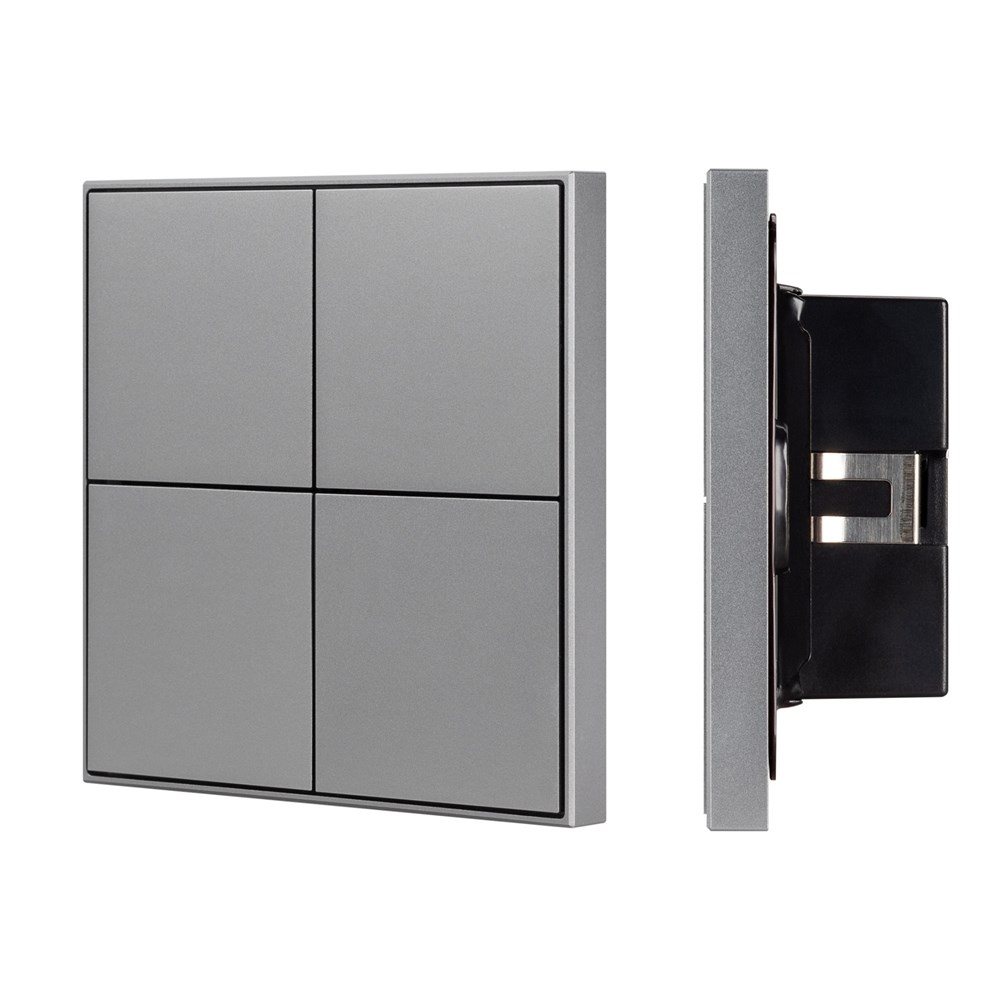 Встраиваемая металлическая панель серого цвета с кнопочным управлением, предназначенная для включения и выключения световых сцен в системах управления светом KNX. Позволяет осуществлять включение/выключение, диммирование, управление шторами и жалюзи, управлять сценами. Поддерживает управление с помощью 4 настраиваемых рокерных клавиш. Каждая клавиша может выполнять функции 2-х клавиш. Устройство совместимо с исполнительными устройствами стандарта KNX, в том числе, мировых производителей ABB, SCHNEIDER ELECTRIC, SIEMENS, ZENNIO и другими. Удобное и точное управление при помощи отдельных механических кнопок для каждой функции. Питание от шины KNX. Габариты устройства составляют 86x86x33 мм, установка в стандартную монтажную коробку. Пластиковый корпус, цвет серый, тонкая рамка, материал - алюминий, отклик вибрацией, светодиодная индикация.