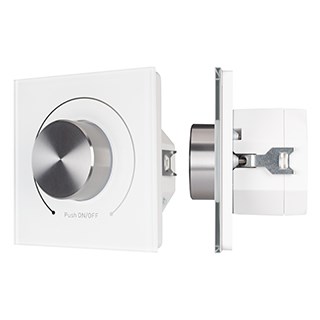 Встраиваемая стеклянная панель белого цвета с роторным вращателем (потенциометром), предназначенная для управления светодиодным или любым другим осветительным оборудованием, работающим в протоколе DALI. С помощью панели осуществляется регулировка яркости и включение/выключение света. Панель совместима с любыми исполнительными устройствами стандарта DALI. К устройству можно подключить одновременно до 32 диммеров DALI. Питание устройства осуществляется от шины DALI, либо от 230В. Установка адреса управления не требуется. Управление выполняется одновременно по всем адресам DALI (команды Broadcast). Габариты устройства составляют 80х80х54 мм, установка в стандартный подрозетник.