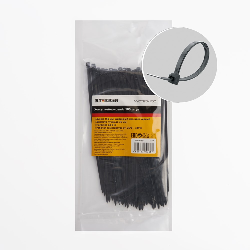 Хомут электромонтажный STEKKER NYCT25-150, одноразовый, черный, материал - нейлон , размер 2.5*150мм, максимальный диаметр пучка - 35мм, нагрузка - 8кг, диапазон рабочих температур -25°C - +85°C, рекомендуемая температура хранениня -2...+25С