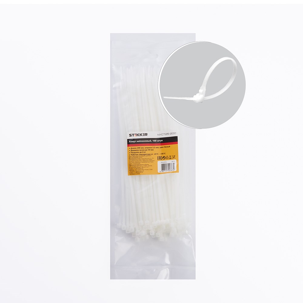 Хомут электромонтажный STEKKER NYCT25-200, одноразовый, белый, материал - нейлон , размер 2.5*200мм, максимальный диаметр пучка - 50мм, нагрузка - 8кг, диапазон рабочих температур -25°C - +85°C, рекомендуемая температура хранениня -2...+25С
