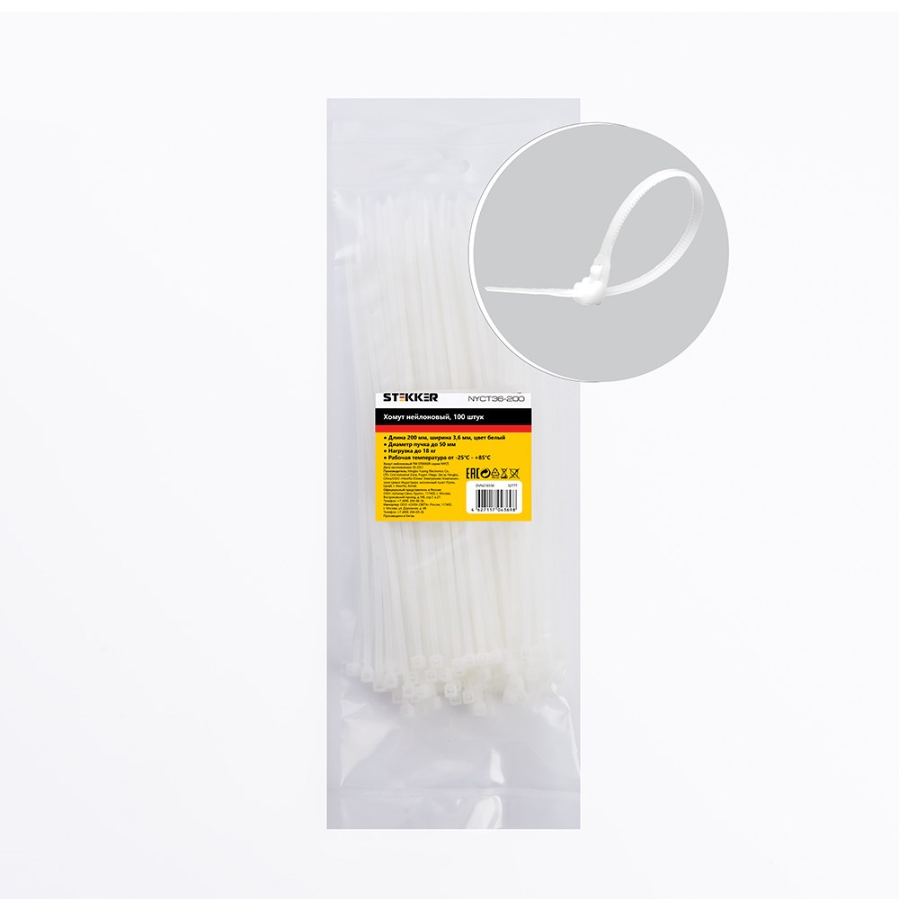 Хомут электромонтажный STEKKER NYCT36-200, одноразовый, белый, материал - нейлон , размер 3,6*200мм, максимальный диаметр пучка - 50мм, нагрузка - 18кг, диапазон рабочих температур -25°C - +85°C, рекомендуемая температура хранениня -2...+25С