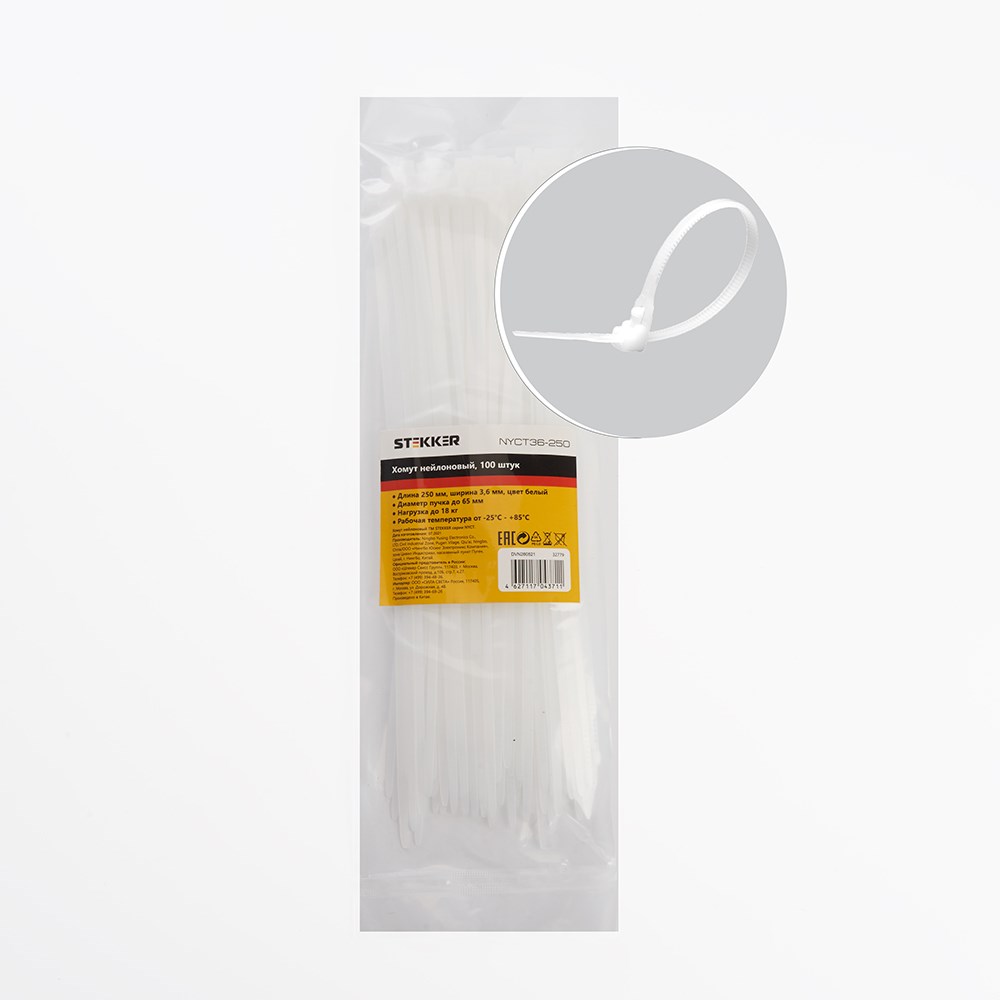 Хомут электромонтажный STEKKER NYCT36-250, одноразовый, белый, материал - нейлон , размер 3,6*250мм, максимальный диаметр пучка - 65мм, нагрузка - 18кг, диапазон рабочих температур -25°C - +85°C, рекомендуемая температура хранениня -2...+25С