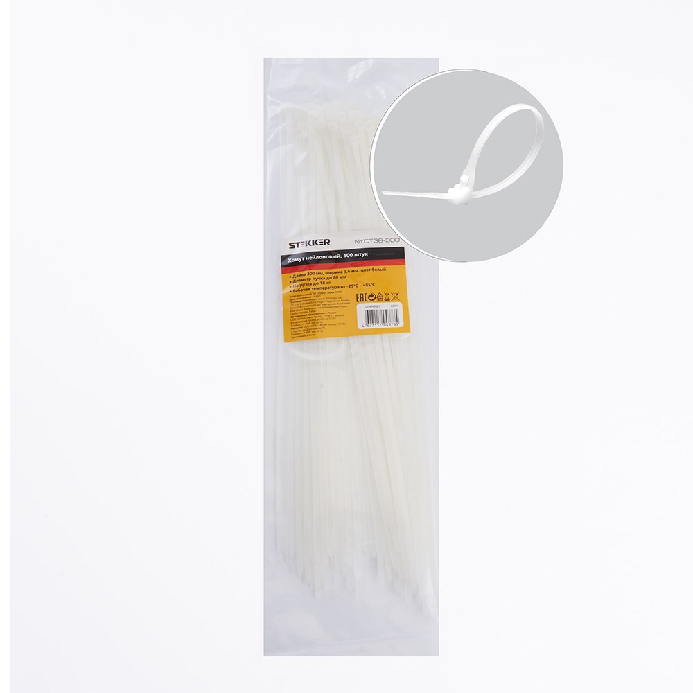 Хомут электромонтажный STEKKER NYCT36-300, одноразовый, белый, материал - нейлон , размер 3,6*300мм, максимальный диаметр пучка - 80мм, нагрузка - 18кг, диапазон рабочих температур -35°C - +80°C, рекомендуемая температура хранениня -2...+25С