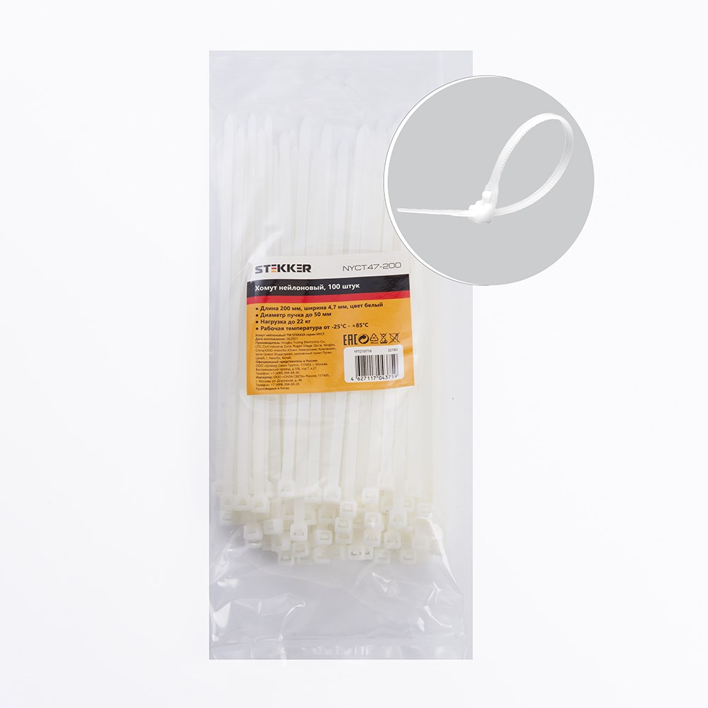 Хомут электромонтажный STEKKER NYCT47-200, одноразовый, белый, материал - нейлон , размер 4,7*200мм, максимальный диаметр пучка - 50мм, нагрузка - 22кг, диапазон рабочих температур -35°C - +80°C, рекомендуемая температура хранениня -2...+25С