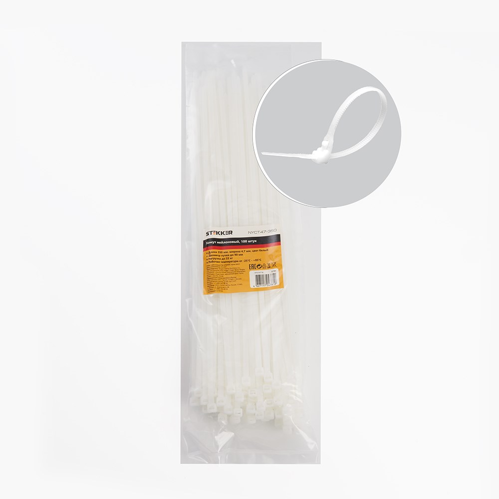Хомут электромонтажный STEKKER NYCT47-350, одноразовый, белый, материал - нейлон , размер 4,7*350мм, максимальный диаметр пучка - 90мм, нагрузка - 22кг, диапазон рабочих температур -35°C - +80°C, рекомендуемая температура хранениня -2...+25С
