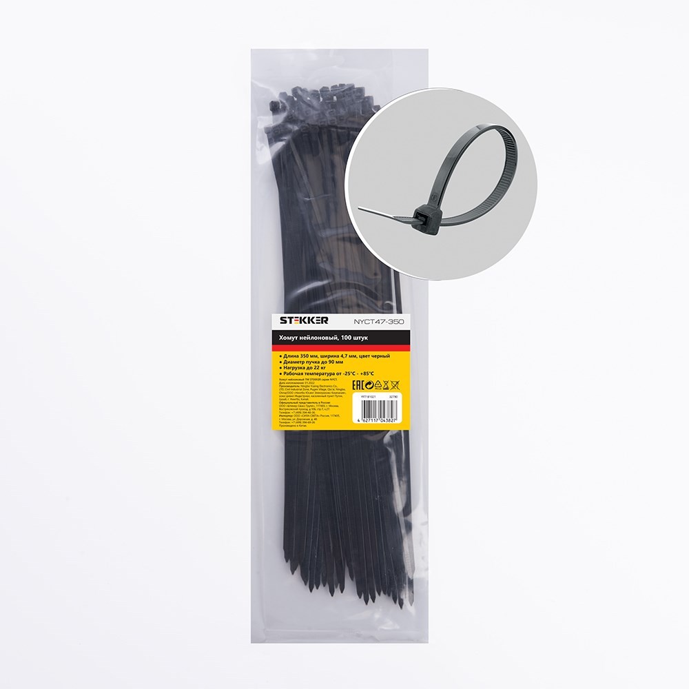 Хомут электромонтажный STEKKER NYCT47-350, одноразовый, черный, материал - нейлон , размер 5*350мм, максимальный диаметр пучка - 90мм, нагрузка - 22кг, диапазон рабочих температур -35°C - +80°C, рекомендуемая температура хранениня +5..+25