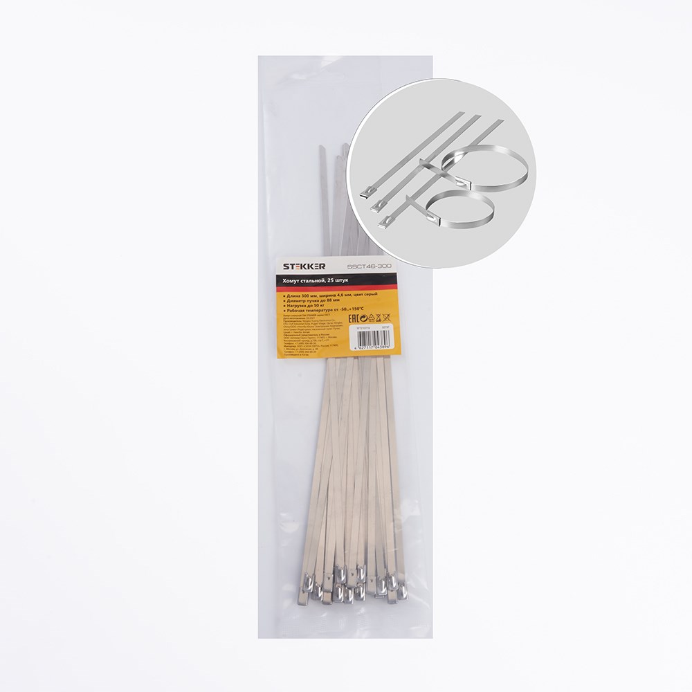 Хомут электромонтажный STEKKER SSCT46-300, одноразовый, серый, материал - сталь, размер 5*300мм, максимальный диаметр пучка - 88мм, нагрузка - 50кг, диапазон рабочих температур -35°C - +80°C, рекомендуемая температура хранениня -