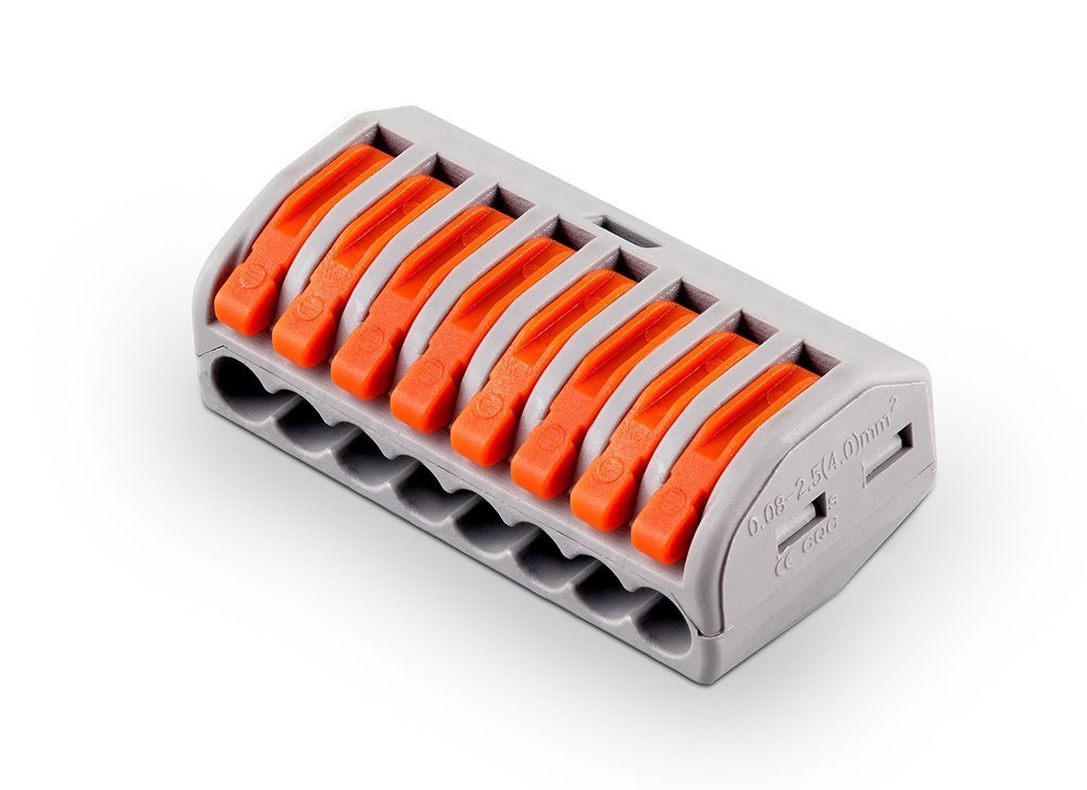 Клемма пружинная универсальная STEKKER LD222-418, 8-проводная 0,08 - 2,5/4 мм2, 400В, 24 A, 32 A, без пасты, материал изделия нейлон, латунь. Тип провода одножильный/многожильный, материал провода латунь/медь, температура окружающей среды -35...+40°C