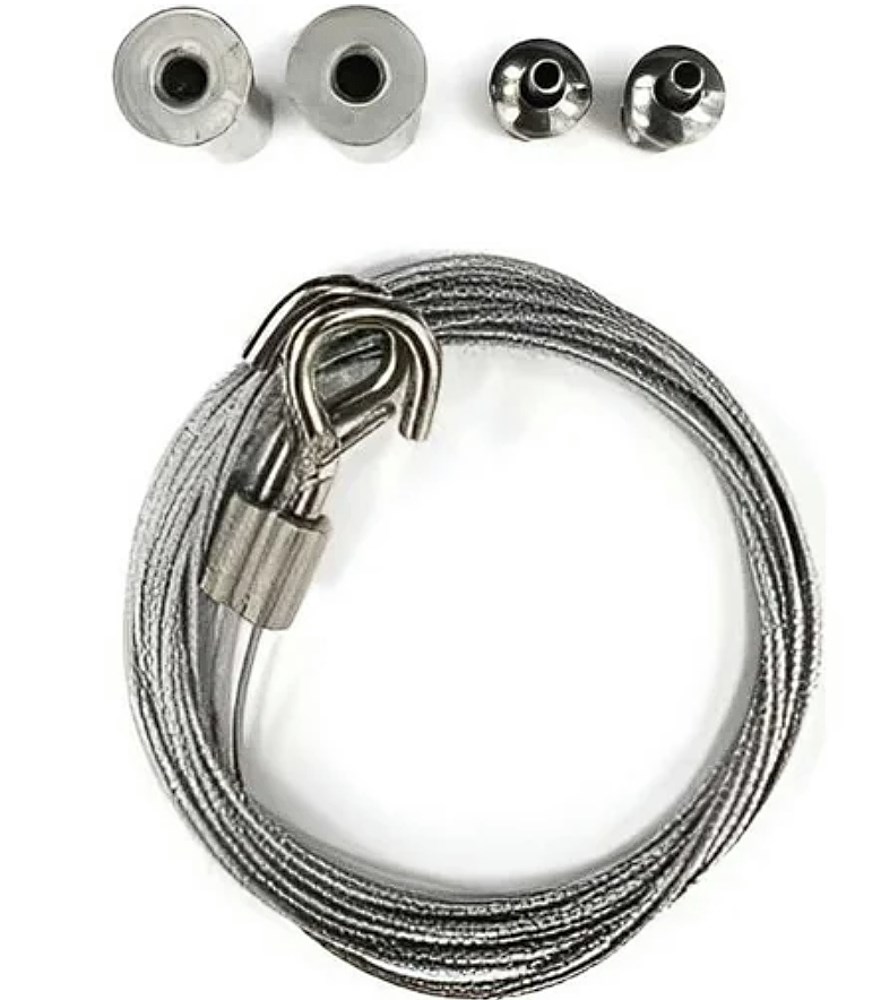 Каждый комплект состоит из тросов требуемой длины (1.5/2/3/5м), также включает в себя все необходимые крепёжные элементы, рассчитанные минимум на 4 точки крепления для создания стабильного, безопасного и надёжного монтажа.