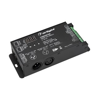 Конвертер цифрового сигнала DMX512 в цифровой сигнал SPI для управления светодиодными лентами и модулями SPI. Конвертер может управлять яркостью, цветом, включением и выключением света. Конвертер совместим с панелями управления с выходом DMX512 и контроллерами DMX512, поддерживает расширение RDM, что обеспечивает двусторонний обмен между конвертером и контроллером DMX/RDM. Также, управление конвертером осуществляется кнопками на корпусе, а информация о режиме отображается на цифровом дисплее. Устройство оснащено разъемами RJ-45 и XLR3, обеспечивающими трансляцию сигнала DMX512 на вход и выход. Также, конвертер выдает выходной сигнал SPI (TTL)x3 и имеет три выходных порта . Питание устройства имеет диапазон напряжений от 12В до 24В, поддерживает управление до 1024 пикселей . Габариты конвертера составляют 165х70х37мм, металлический корпус чёрного цвета. Устройство совместимо с пультами и панелями серии SMART по радиоканалу 2.4G.