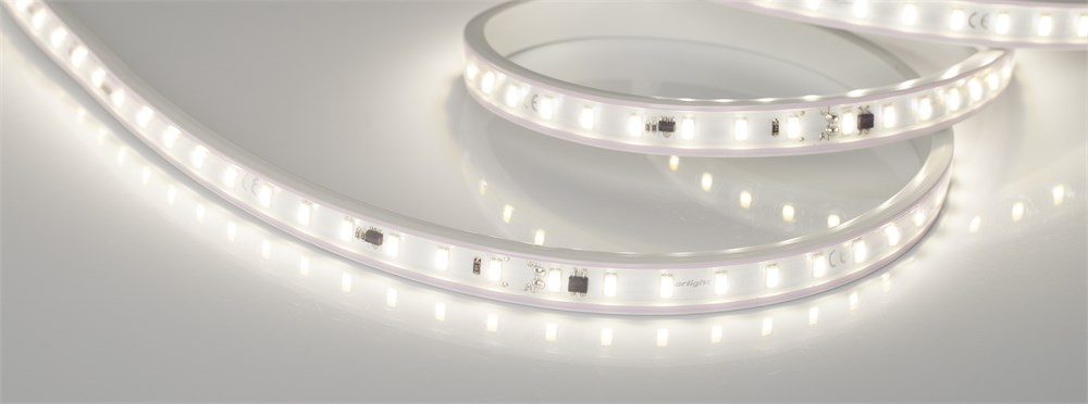 Стабилизированная лента шириной 15.5 мм в прозрачной ПВХ-оболочке с высокой степенью пылевлагозащиты (IP65). Светодиоды SMD 5630 (72 шт/м) дневного белого цвета свечения (3800–4300 К) с индексом цветопередачи CRI>80. Использование интегральных стабилизаторов тока позволяет подключать ленту длиной до 50м, обеспечивая при этом равномерную яркость свечения по всей ленты. При подключении нескольких лент, подавать питание на каждые 50м отдельным кабелем. Запрещается последовательное подключение лент более 50м. Прозрачные коннекторы для создания непрерывных световых линий. Лента изгибается вертикально от плоскости. Контурная подсветка, оформление наружной рекламы. Крепление на скобы. В комплекте заглушка и провод питания. Диммирование осуществляется диммерами TRIAC в диапазоне 15%-90%.