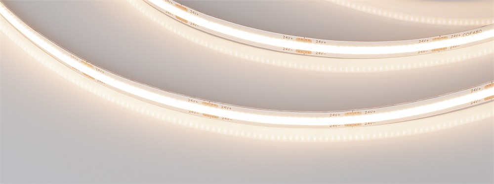 Светодиодная лента COB серии X480, светодиоды CSP, 480 светодиодов на метр, мощность 10 Вт/м. Высокий индекс цветопередачи CRI>90 обеспечивает точное восприятие цветовых оттенков при освещении любых жилых, офисных или производственных помещений. Предназначена для декоративной подсветки интерьера, позволяет создать эффект сплошной идеальной линии света без применения рассеивающих экранов. Используется для рекламных конструкций и витрин. Рекомендуется установка на профиль.