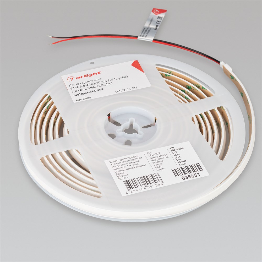 Лента герметичная RTW-PW-A280-10mm 24V Day4000 (10 W/m, IP66, 2835, 5m) (Arlight, Матовая)