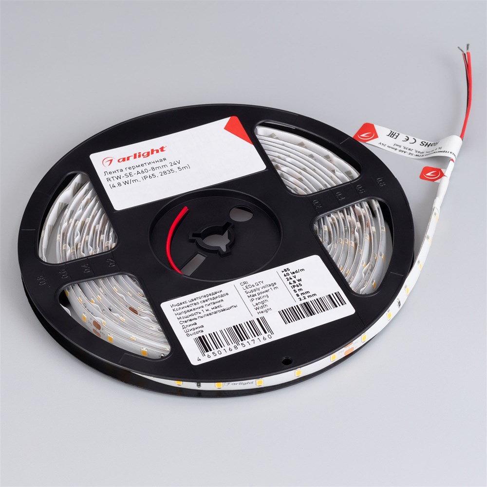 Светодиодная герметичная лента RTW серии A60, шириной 8 мм, мощностью 4.8 Вт/м, IP65. Напряжение питания 24 В. Светодиоды SMD 2835 (60 шт/м) теплого цвета свечения (2700K). Индекс цветопередачи CRI>85. Минимальный отрезок 100 мм (3 светодиода). Применяется для декоративной подсветки любых жилых, коммерческих помещений, декоративной подсветки интерьеров, потолочных ниш, рабочих зон кухни, влажных зон, мебели, рекламных конструкций и витрин. Обязательна установка на профиль.