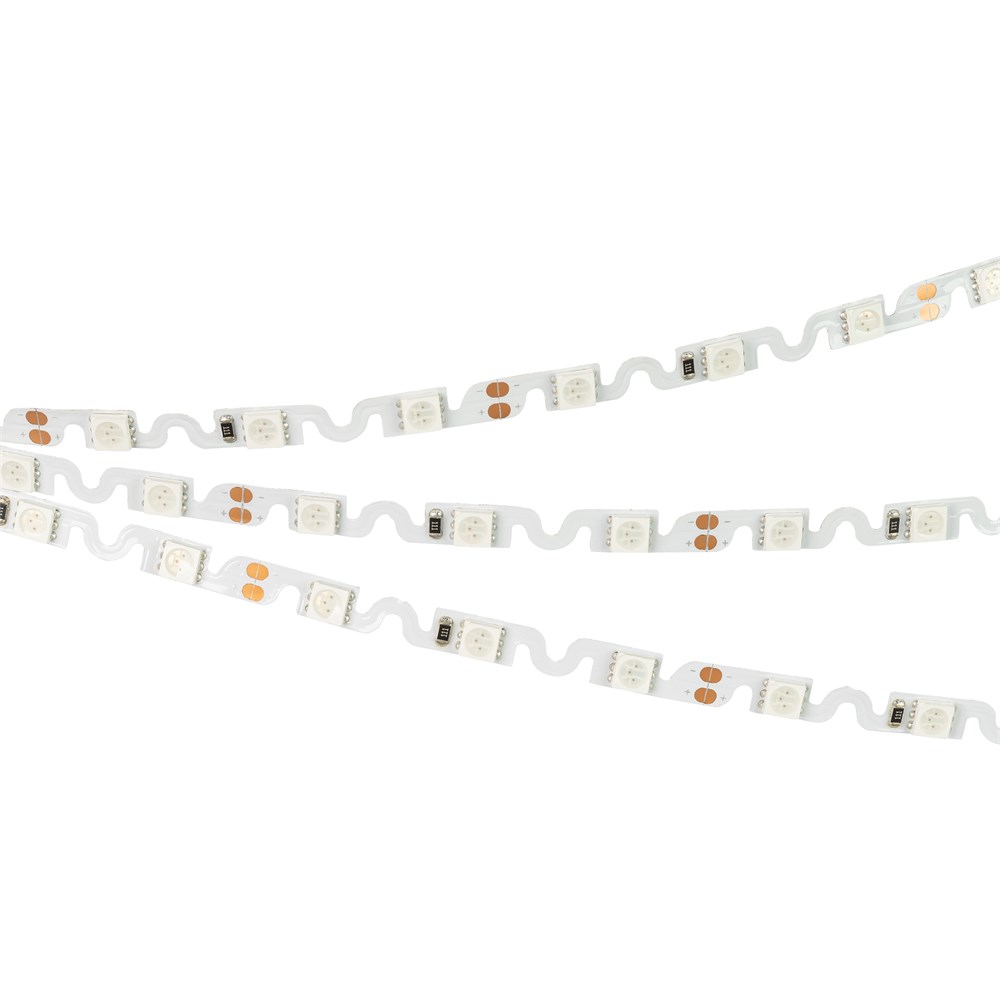 Светодиодная гибкая лента шириной 6.1 мм. Легко изгибается на плоскости за счет фигурной платы в форме волны. Светодиоды SMD 5060 (48 шт/м) желтого цвета свечения. Мощность 11.5 Вт/м, напряжение питания 12 В. Индекс цветопередачи CRI>85. Минимальный отрезок 62.5 мм (3 светодиода). Подходит для установки в криволинейные пазы. Применяется для подсветки изогнутых поверхностей, букв, витрин и ниш.