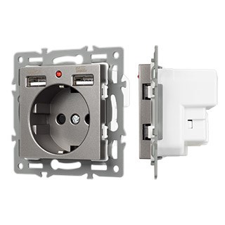 Механизм розетки с заземлением на 1 пост, совместим с рамками серий VERSA/GLARE/PRESTO. Помимо основного разъема, так же предусмотрено два выхода USB Type-A. Накладной тип монтажа позволяет с легкостью произвести монтаж/замену. Видимая часть механизма выполнена из высококачественного тугоплавкого пластика серого цвета. Контактная часть присоединяется при помощи винтовых зажимов, а усиленные монтажные лапки надежно фиксируют механизм в установочном подрозетнике. Степень защиты IP20 допускает использование устройства во влажных помещениях, с соблюдением требований эксплуатации.