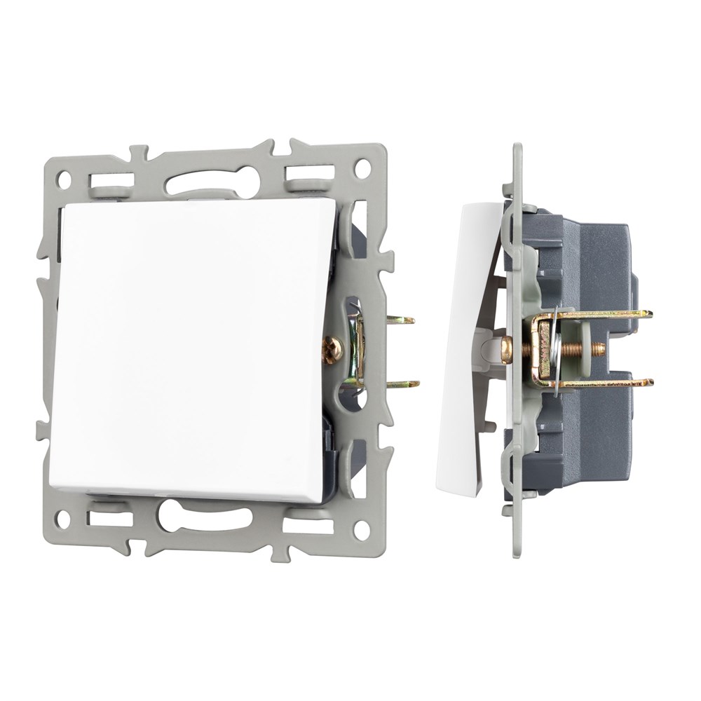 Механизм выключателя света одноклавишный на 1 пост, совместим с рамками серий VERSA/GLARE/PRESTO. Скрытый тип монтажа позволяет гармонично встроить в интерьер любого современного дизайн-проекта. Видимая часть механизма выполнена из высококачественного тугоплавкого пластика белого цвета. Контактная часть присоединяется при помощи винтовых зажимов, а усиленные монтажные лапки надежно фиксируют механизм в установочном подрозетнике. Степень защиты IP44 допускает использование устройства во влажных помещениях, с соблюдением требований эксплуатации.