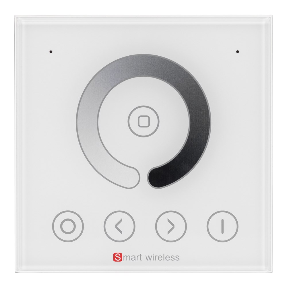 Настенная сенсорная панель со стекляным покрытием предназначена для встройки в стандартный подрозетник. С помощью панели возможно управление одноцветной светодиодной лентой - включение/выключение, регулировка яркости. Панель имеет сенсорный круг для точного и легкого изменения яркости ленты, кнопки переключения между 4-мя параллельными каналами, а также кнопки включения и выключения света. Изделие выполнено в белом цвете из высококачественного стекла, устойчивого к появлению мелких царапин и сколов. Питание панели имеет диапазон напряжений от 12В до 24В, максимальный ток 4А на 1 канал, максимальная мощность 192-384Вт (в зависимости от напряжения питания). Габариты панели составляют 86х86х33мм.