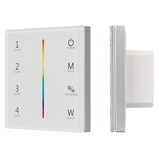 Встраиваемая сенсорная панель белого цвета из стекла, с защитой от мелких царапин. Предназначена для управления мультицветными (RGBW) источниками света (ШИМ) с помощью сенсорной полосы. Основные функции: включение/выключение света, регулировка яркости, изменение цвета, включение и выключение 4-х пользовательских световых сцен. Изделие можно использовать как диммер с 4 выходами для подключения мультицветных лент. Возможно применение как однозонный пульт дистанционного управления диммерами и контроллерами серии SMART. Устройство может управляться пультами управления или другими панелями серии SMART. К одной панели можно привязать неограниченное количество диммеров и контроллеров. Устройство совместимо с диммерами и контроллерами серии SMART, с управлением по радиоканалу 2.4G. Питание 12-24В, 4 канала управления, макс. ток 3А на канал, суммарная мощность 144-288 Вт. Габариты: 86х86х37 мм, корпус из пластика, лицевая часть из стекла. Установка в монтажные коробки в стандартного размера.