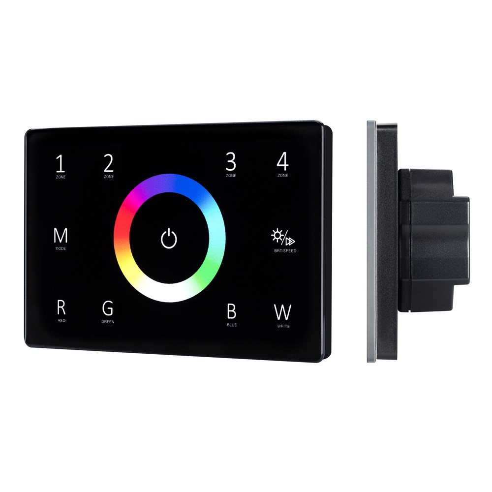 Встраиваемая сенсорная панель в "итальянском" стиле, изготовленная из высококачественного стекла, защищенного от появления царапин. Изделие позволяет осуществлять основные функции управления светом: включение/выключение, регулировка яркости, управление цветом (RGBW), сохранение предустановок для 4 световых зон. Панель совместима с диммерами и контроллерами SMART по радиоканалу 2.4G (количество привязываемых диммеров и контроллеров не ограничено) и может управлять DMX-диммерами по проводной шине DMX512. Выходной сигнал DMX соответствует стандартному протоколу DMX512 и совместим с оборудованием DMX любого производителя. Панель чёрного цвета, питание от сети 230В. Габариты устройства 120х80х37 мм, встраивается в стандартную монтажную коробку.