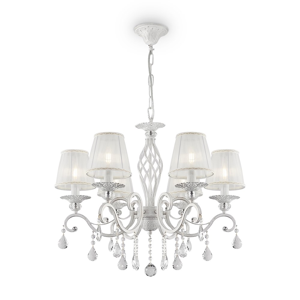 Металлическая арматура, оттенки – латунь, белый с золотом. Модели с откры тыми источниками света и с абажурами. Абажуры из органзы, оттенки – бежевый, белый. Закрученный по спирали декор центральной оси. Подвески из кристаллов. - Высота люстр регулируется.