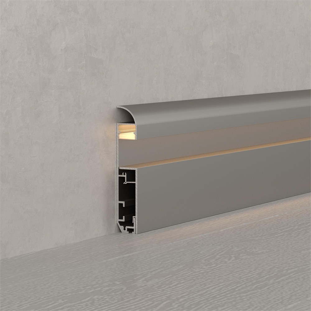 Накладной двухкомпонентный профиль-плинтус из анодированного алюминия с кабель-каналом для контурной подсветки помещения. Габаритные размеры этого профиля составляют 2000 мм в длину, 14,8 мм в ширину и 79,7 мм в высоту. Площадка для установки светодиодных лент позволяет использовать ленту шириной до 12,2 мм и мощностью до 28 Вт/м. Это обеспечивает гибкость в выборе светодиодных лент и создает потрясающие световые решения.