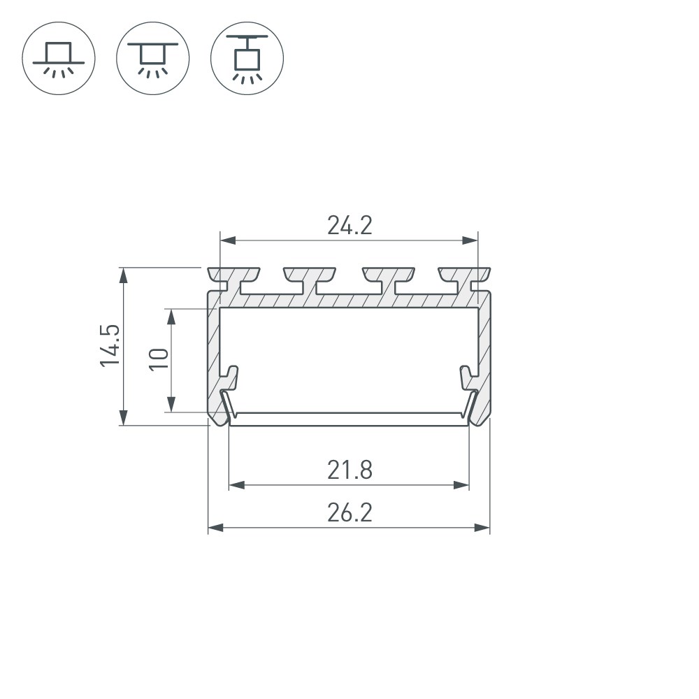 Габаритные размеры профиля составляют 3000 мм в длину, 26,2 мм в ширину и 14,5 мм в высоту. Площадка для установки светодиодных лент позволяет использовать ленту шириной до 24,2 мм и мощностью до 18,3 Вт/м. Это обеспечивает гибкость в выборе светодиодных лент и создает потрясающие световые решения.