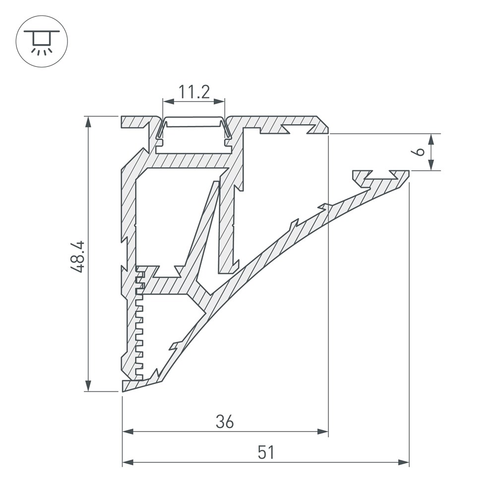 Алюминиевый анодированный профиль для монтажа и подсветки полок из стекла, пластика, дерева толщиной от 6 мм до 20 мм. Максимальная ширина полки 25 см. Максимально допустимый вес: 5 кг на каждые 30 см длины. Свечение в двух направлениях: подсветка стекла, подсветка прилегающей стены (наверх). Габаритные размеры (L×W×H): 2000x51x64 мм. Ширина площадки для ленты 11,2 мм. Заглушки и другие аксессуары приобретаются отдельно. Цена за 1 метр.