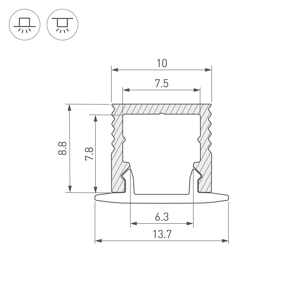 Накладной/встраиваемый микро-профиль из анодированного алюминия для подсветки мебели, пазов, ниш и других элементов интерьера. Габаритные размеры профиля составляют 2000 мм в длину, 10 мм в ширину и 8,8 мм в высоту. Площадка для установки светодиодных лент позволяет использовать ленту шириной до 7,5 мм и мощностью до 14 Вт/м. Это обеспечивает гибкость в выборе светодиодных лент и создает потрясающие световые решения.