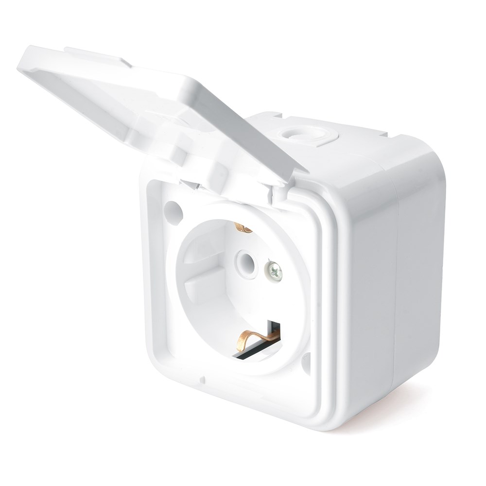Розетка STEKKER PST16-20-44 (IP44 при закрытой крышке, IP20 при открытой крышке) на 1 гнездо, без заземления. Материал: ABS пластик, цвет белый, размер 70*70*50,9мм. Номинальное напряжение 250, номинальный ток 16А, диапазон рабочих температур 0..+35°C, IP44
