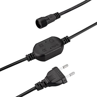 Шнур питания специально разработан для подключения светодиодных гирлянд с эффектом мерцания (FLASH). В комплект входит шнур питания с вилкой европейского стандарта (IP44), 2pin разъем для подключения к гирлянде, а также выпрямитель AC/DC (1.6А). Оболочка из черного ПВХ придает ему элегантный внешний вид. Длина провода составляет 1,5 метра, что позволяет удобно располагать гирлянду.