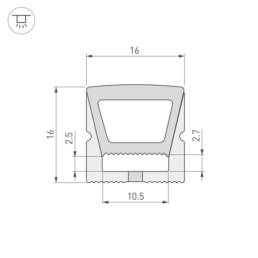 Цельнолитой силиконовый гибкий профиль белого цвета с УФ-защитой. Габаритные размеры профиля составляют 5000 мм в длину, 16 мм в ширину и 16 мм в высоту. Вертикальный изгиб TOP, минимальный радиус изгиба 60 мм. Угол излучения 115°. Для удобства установки ленты по всей длине профиля протянута нить. Площадка для установки светодиодных лент позволяет использовать ленту шириной от 10 до 10,5 мм, высотой до 2,85 мм и мощностью до 10 Вт/м. Это обеспечивает гибкость в выборе светодиодных лент и создает потрясающие световые решения. Для установки во влажных помещениях необходима герметизация при помощи двухкомпонентного эпоксидного герметика. Класс пылевлагозащиты – IP65 (при соблюдении технологии герметизации). Этот продукт представляет отличное решение для создания современных световых проектов и обеспечивает надежную и стильную основу для установки светодиодов.