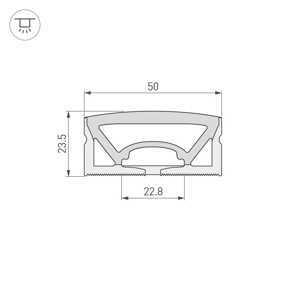 Цельнолитой силиконовый гибкий профиль белого цвета с УФ-защитой. Габаритные размеры профиля составляют 5000 мм в длину, 50 мм в ширину и 23,5 мм в высоту. Вертикальный изгиб TOP, минимальный радиус изгиба 1,25 м. Угол излучения 110°. Для удобства установки ленты по всей длине профиля протянута нить. Площадка для установки светодиодных лент позволяет использовать ленту шириной от 20 до 22 мм, высотой до 6 мм и мощностью до 20 Вт/м. Это обеспечивает гибкость в выборе светодиодных лент и создает потрясающие световые решения. Для установки во влажных помещениях необходима герметизация при помощи двухкомпонентного эпоксидного герметика. Класс пылевлагозащиты – IP65 (при соблюдении технологии герметизации). Этот продукт представляет отличное решение для создания современных световых проектов и обеспечивает надежную и стильную основу для установки светодиодов.