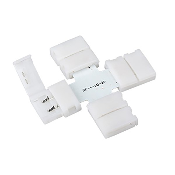 Крестовой пластиковый разветвитель с разъемами на фиксаторах для соединения одноцветных лент шириной 10 мм. Максимальный допустимый ток 4 А. Не рекомендуется соединять длинные отрезки лент.