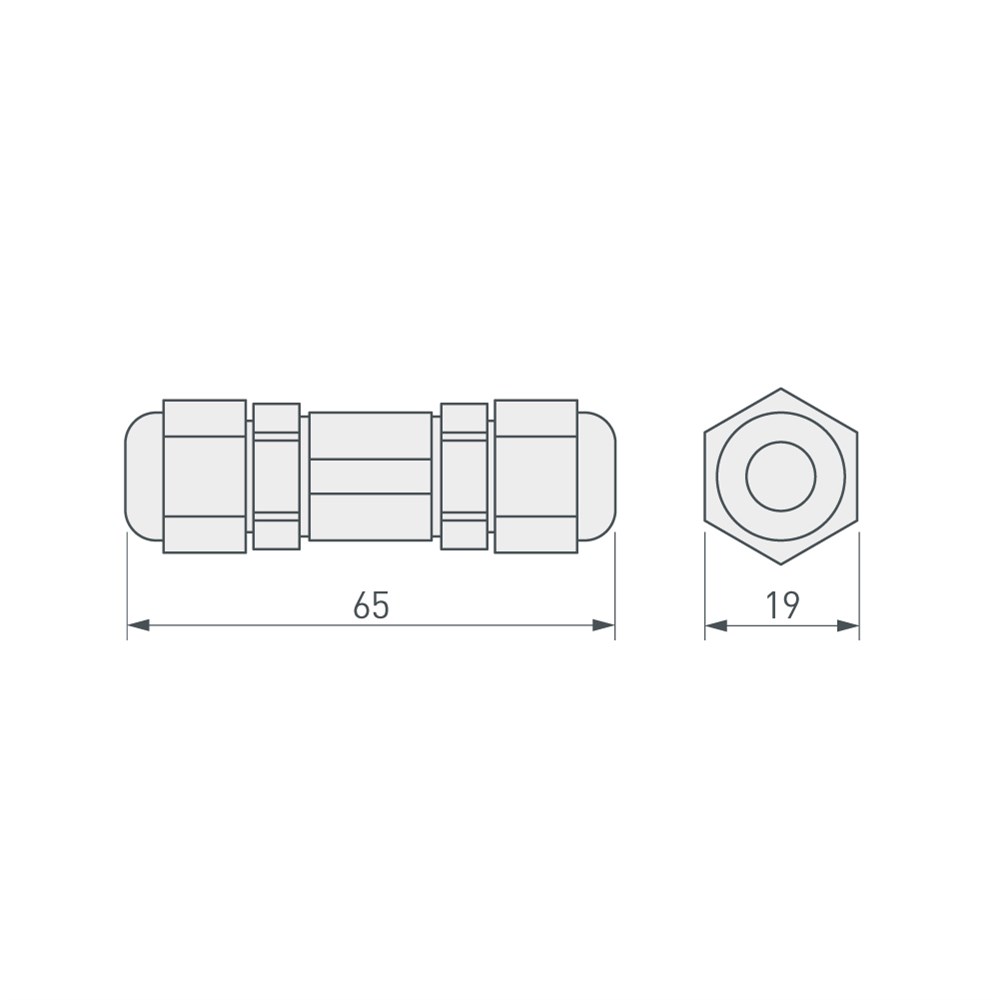 Герметичный соединитель с высокой степенью защиты до IP68 для электрической проводки под кабель сечением 4-10 мм. Рекомендуемое напряжение 12-24В. Габаритные размеры соединителя составляют 65 мм в длину, 19 мм в ширину и 19 мм в высоту.