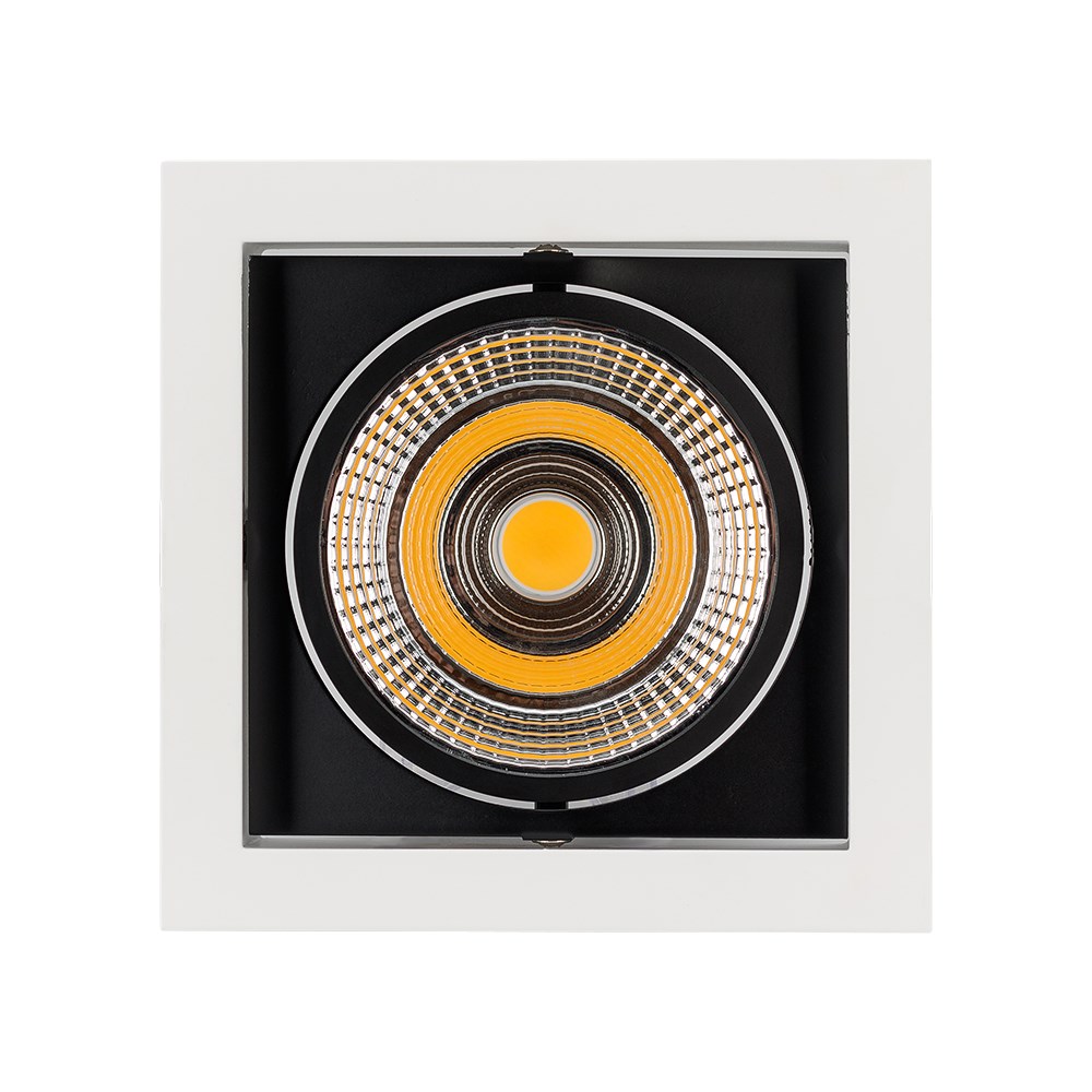 Встраиваемый карданный поворотный светильник CL-KARDAN-S152x152-25W Warm3000 (WH-BK, 30 deg) мощностью 25 Вт, с белым теплым цветом свечения 3000 K и высоким уровнем цветопередачи CRI>80 для создания качественного направленного освещения. За основу поворотного механизма светильника взят принцип кардана – подвижное соединение двух колец, вложенных одно в другое. Световой модуль отклоняется на 45°, что позволяет с лёгкостью регулировать направление пучка света и его концентрацию на определенной зоне. Особая конфигурация корпуса из белого алюминия с черными вставками оригинально смотрится в интерьере и позволяет эффективно отводить тепло, продлевая срок службы светодиодов. Светильник с узким углом рассеивания 30° и световым потоком 2200 лм отлично подходит для локальной акцентной подсветки витрин, прилавков магазинов, бутиков и стендов выставочных залов. Популярно совместное использование с трековыми системами или светильниками Downlight. Легко устанавливается с помощью пружин в монтажное отверстие размером 140х