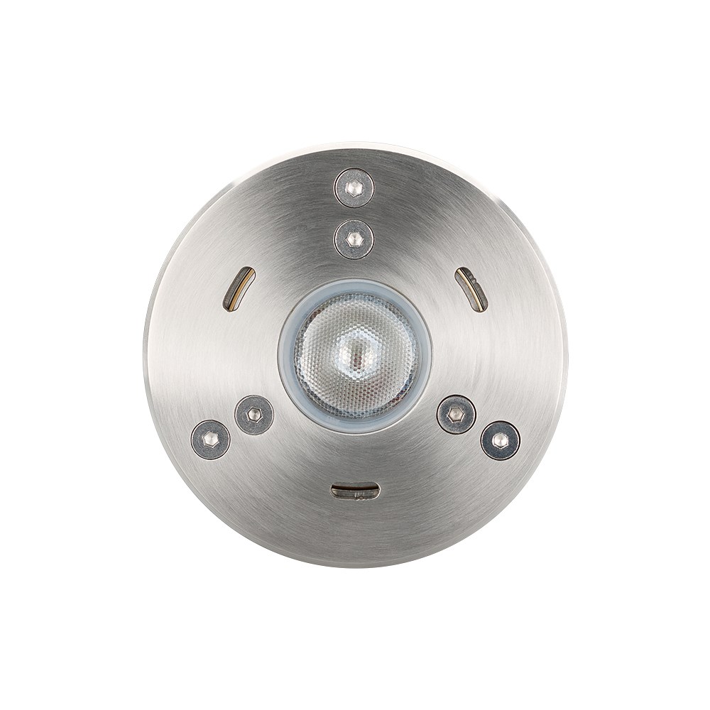 Подводный светодиодный светильник KT-AQUA-COLOR-R85-9W RGB (SL, 25 deg, 12V) мощностью 9 Вт с цветом свечения (RGB) предназначен для подводного освещения: подсветки водоемов, фонтанов, бассейнов и создания многоцветных статичных и динамических световых композиций. Узкий угол излучения 25° и световой поток 540 лм дает возможность решать задачу точечной подсветки. Влагонепроницаемый корпус серебристого цвета IP68 с размерами Ø84хН48 мм выполнен из нержавеющей стали и способен работать при полном погружении в воду. Закладная часть из ударопрочного нейлона защищена от коррозии и обеспечивает длительный срок эксплуатации. Оптический блок закрыт закаленным стеклом с увеличенной толщиной 10мм. Управление цветами и яркостью свечения выполняется с помощью RGB ШИМ-контроллера, а при подключении питания необходимо использовать стабилизированный источник постоянного напряжения 12 В. Мощность источника питания должна быть на 25% выше суммарной мощности подключаемых светильников. Для удобства монтажа в комплект входит пров