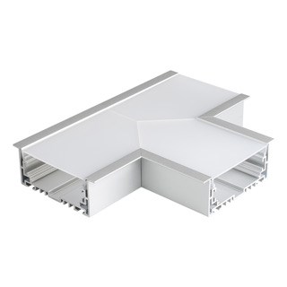 Т-образный угол в сборе для соединения трех профилей S2-LINIA94-F под прямыми углами 90° в одной плоскости в комплекте с матовым экраном и соединителями. Экран образует Т-образную фигуру на плоскости. Применятся при изготовлении светильников сложной геометрии.
