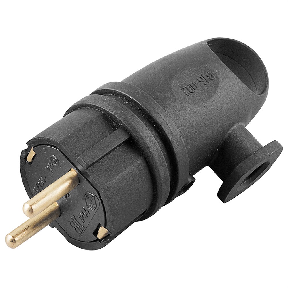 Вилка угловая с ушком STEKKER RPG16-21-442, с заземлением. Для проводов сечением 1мм2. Материал изделия каучук; цвет черный; размер 102*40*45мм. Номинальное напряжение 250В, Номинальный ток 16А, диапазон рабочих температур 0..+40°C, степень пылевлагозащиты IP44