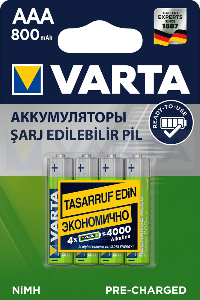 В упаковке 4 аккумуляторные батарейки емкостью 800 мАч, типоразмер ААА/LR03. Аккумуляторы Varta предзаряженные и готовы к использованию.
