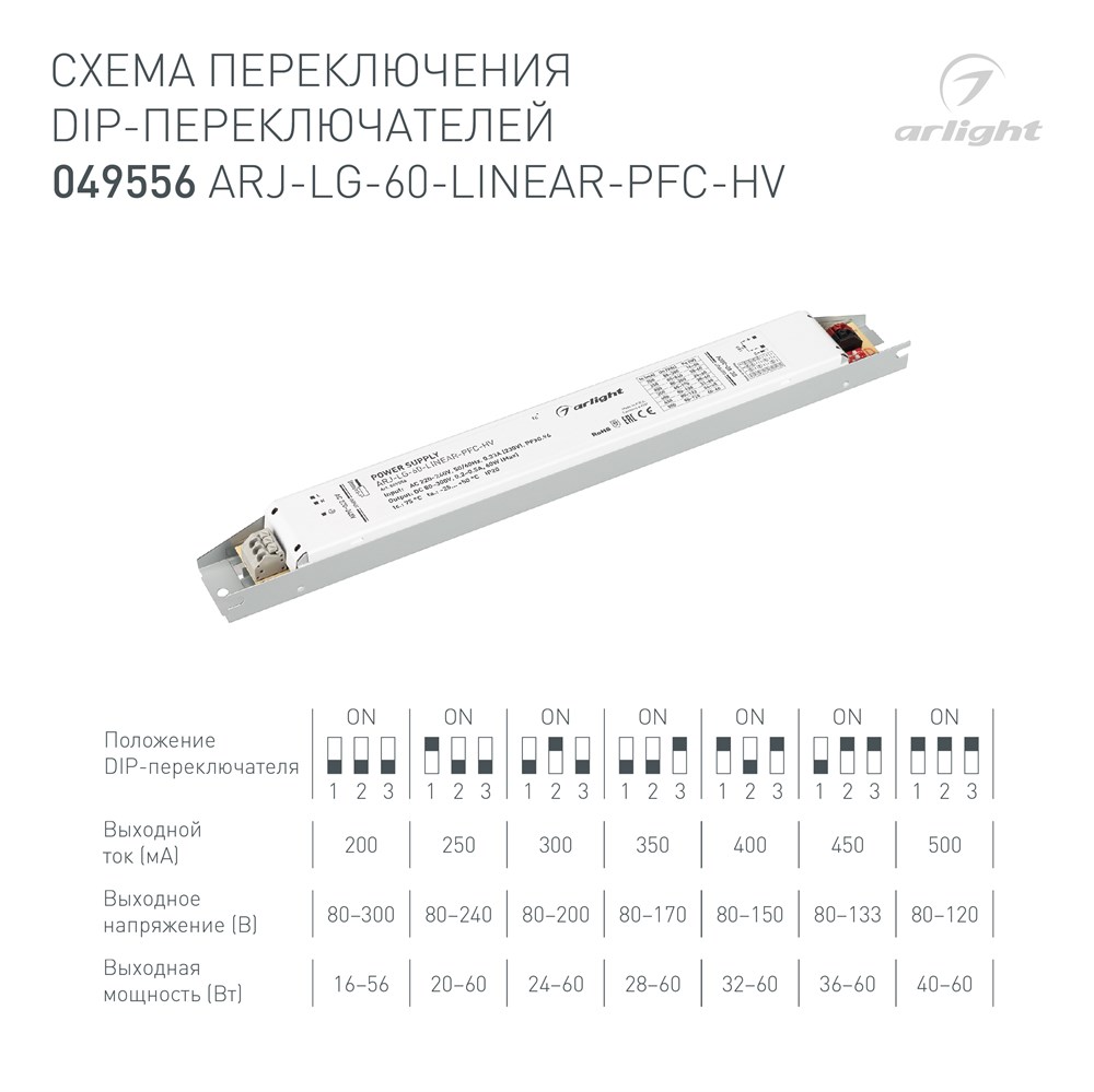 Блок питания ARJ-LG-60-LINEAR-PFC-HV (60W, 80-300V, 0.2-0.5A) (Arlight, IP20 Металл, 5 лет)