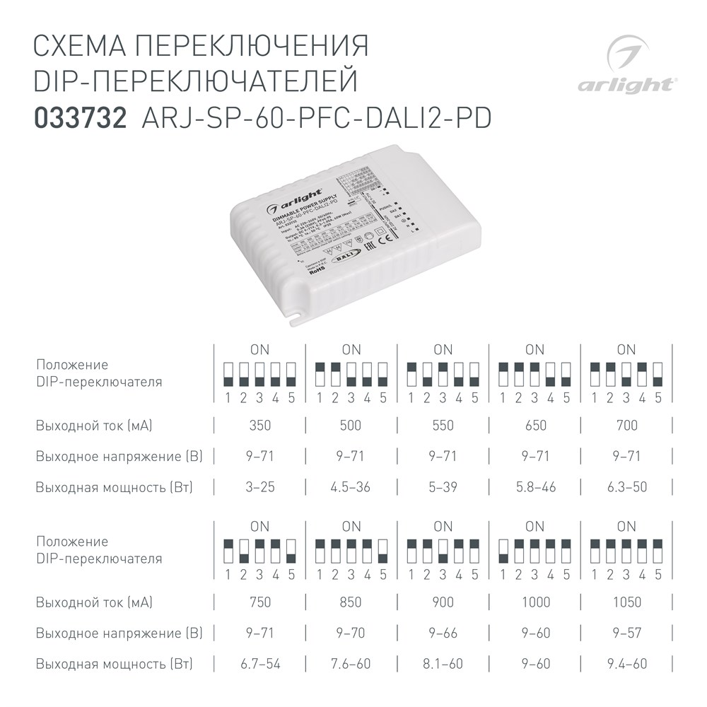 Блок питания ARJ-SP-60-PFC-DALI2-PD (60W, 9-71V, 0.35 -1.05A) (Arlight, IP20 Пластик, 5 лет)